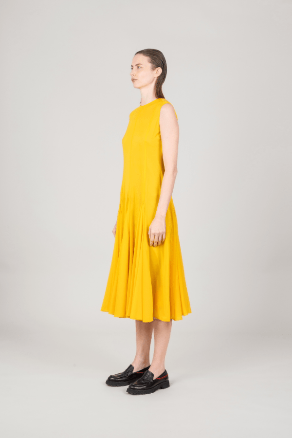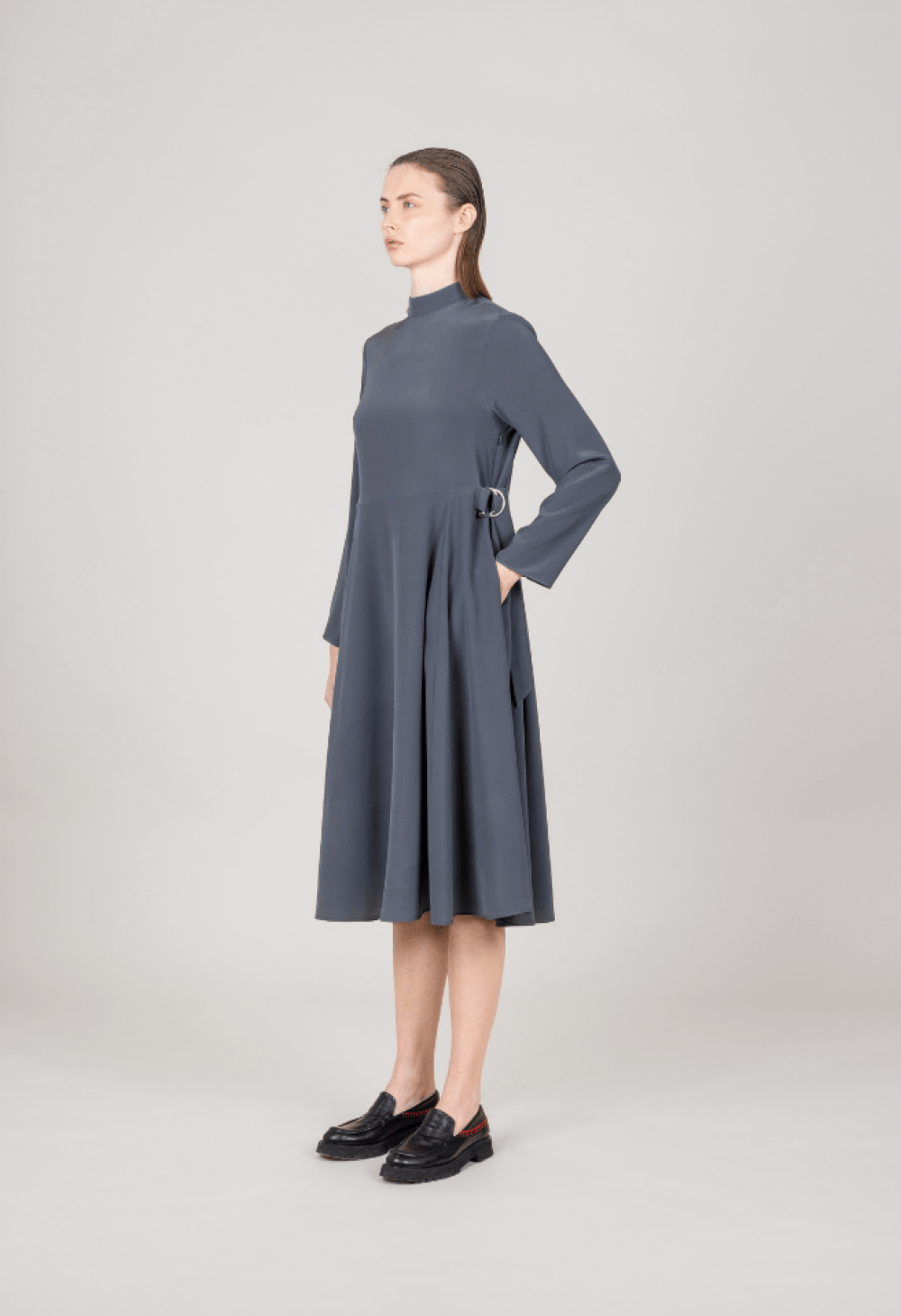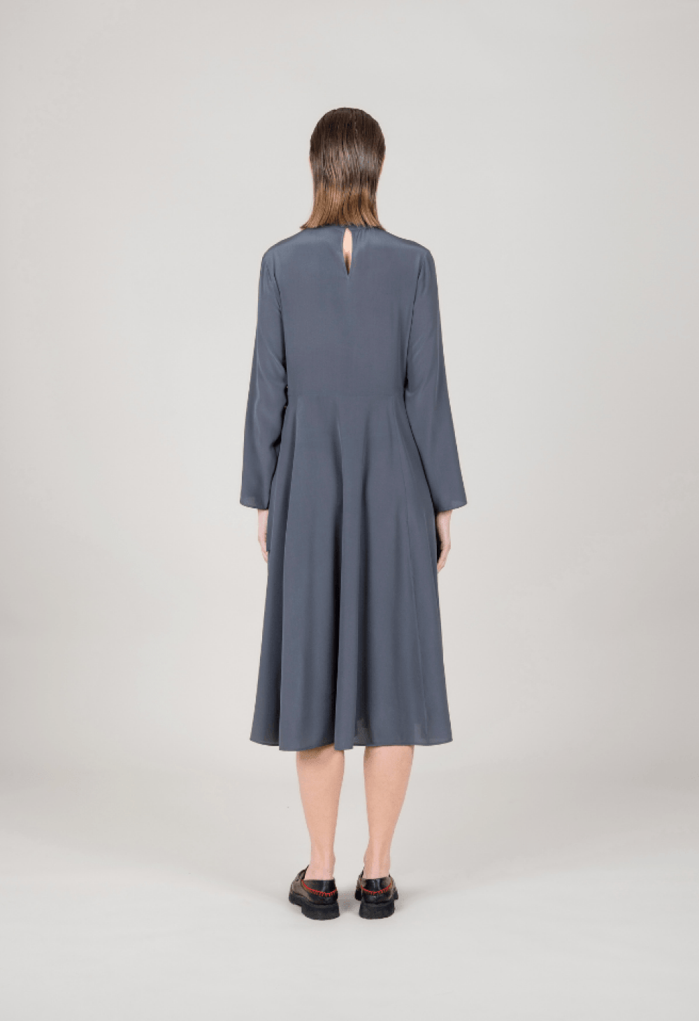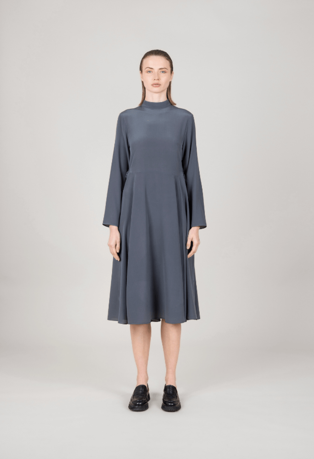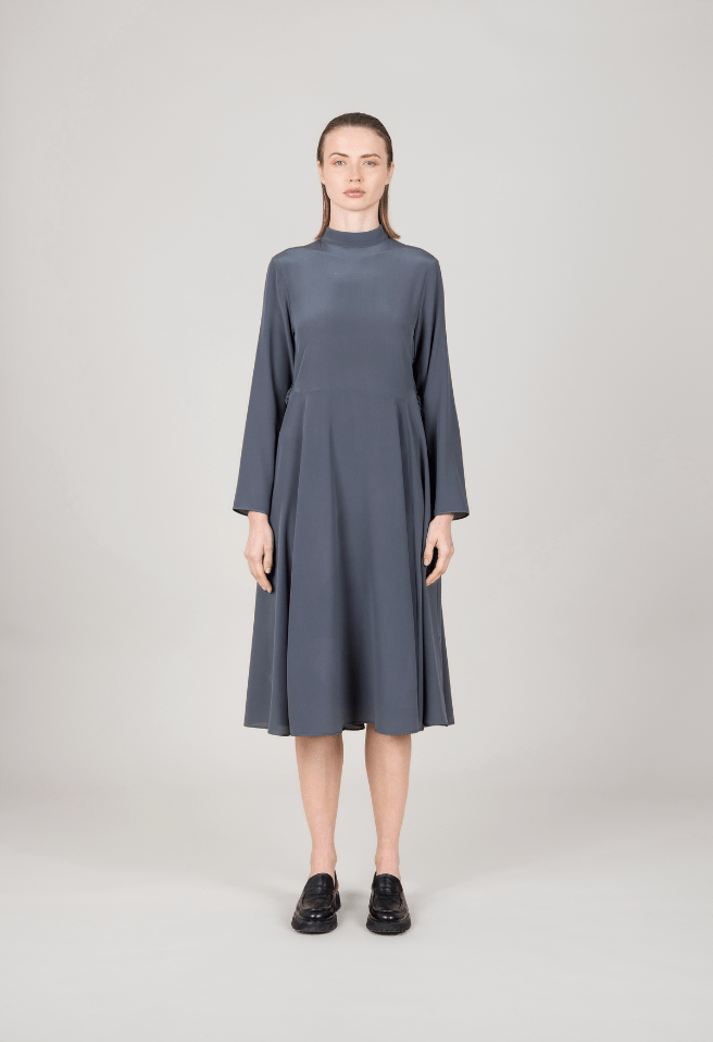 Abito midi in pura seta dalla linea fluida, con maniche morbide e gonna a mezza ruota. Vita regolabile con lacci e fibbia in metallo per una vestibilità su misura. Eleganza leggera e raffinata.