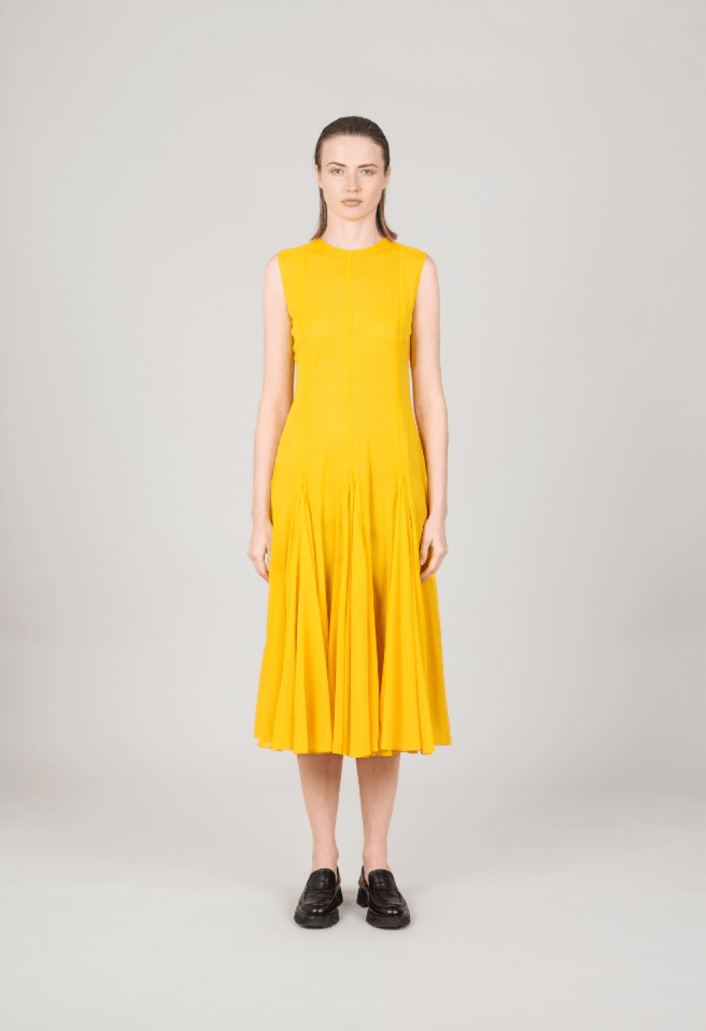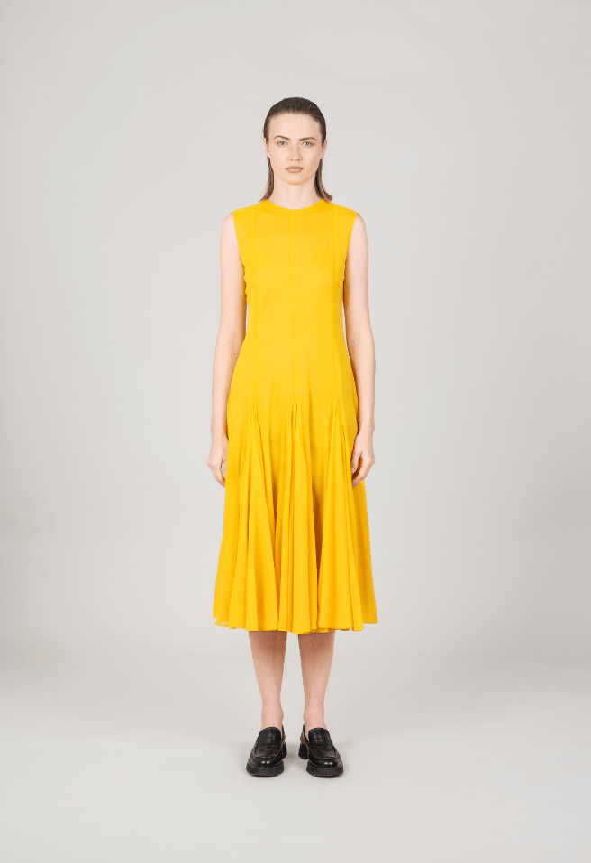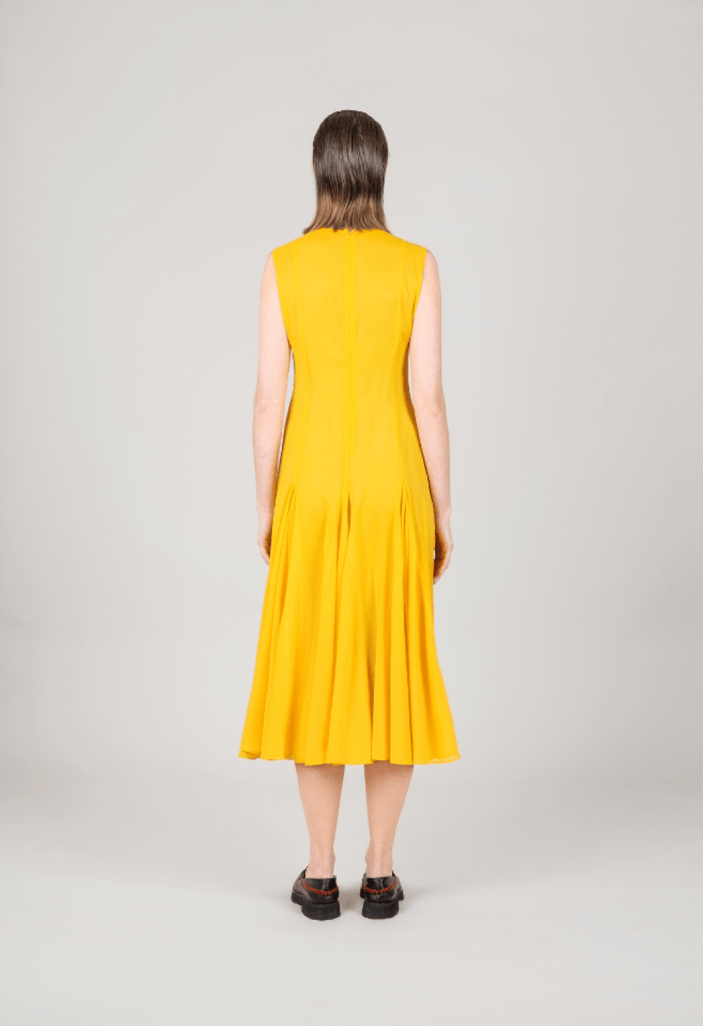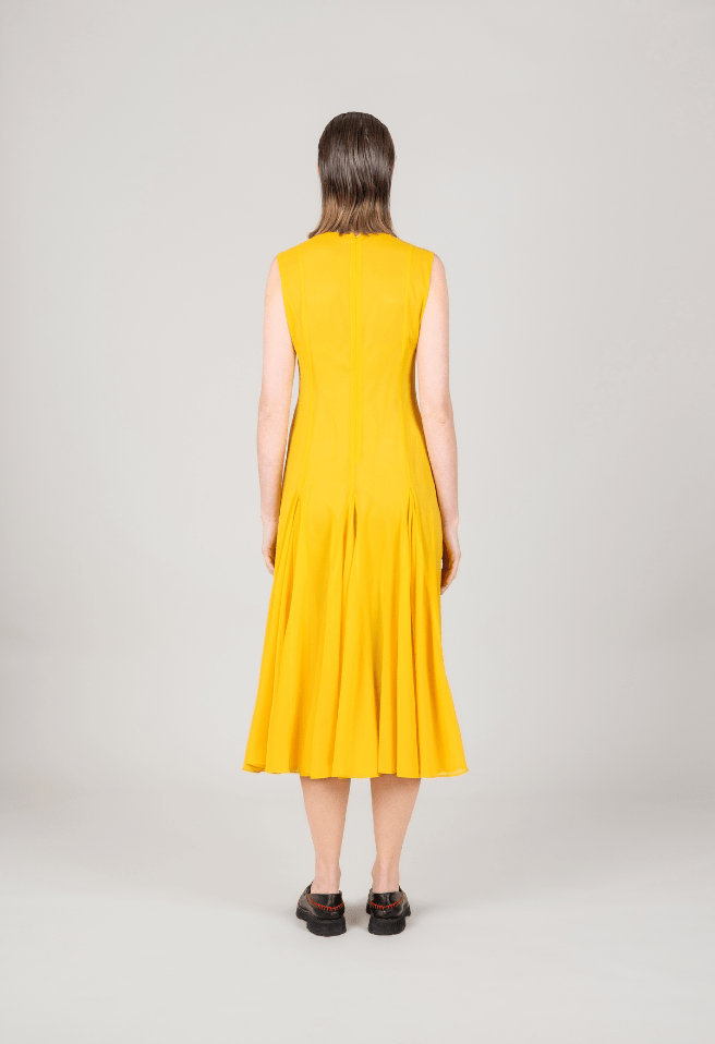 Abito midi senza maniche con costruzione a teli e gonna ampia a spicchi applicati. L'abito include abitino sottoveste removibile.