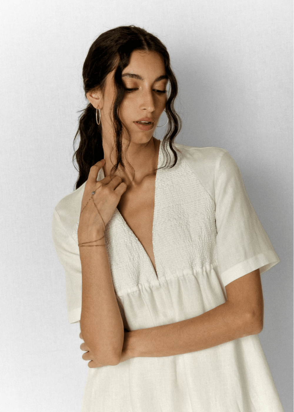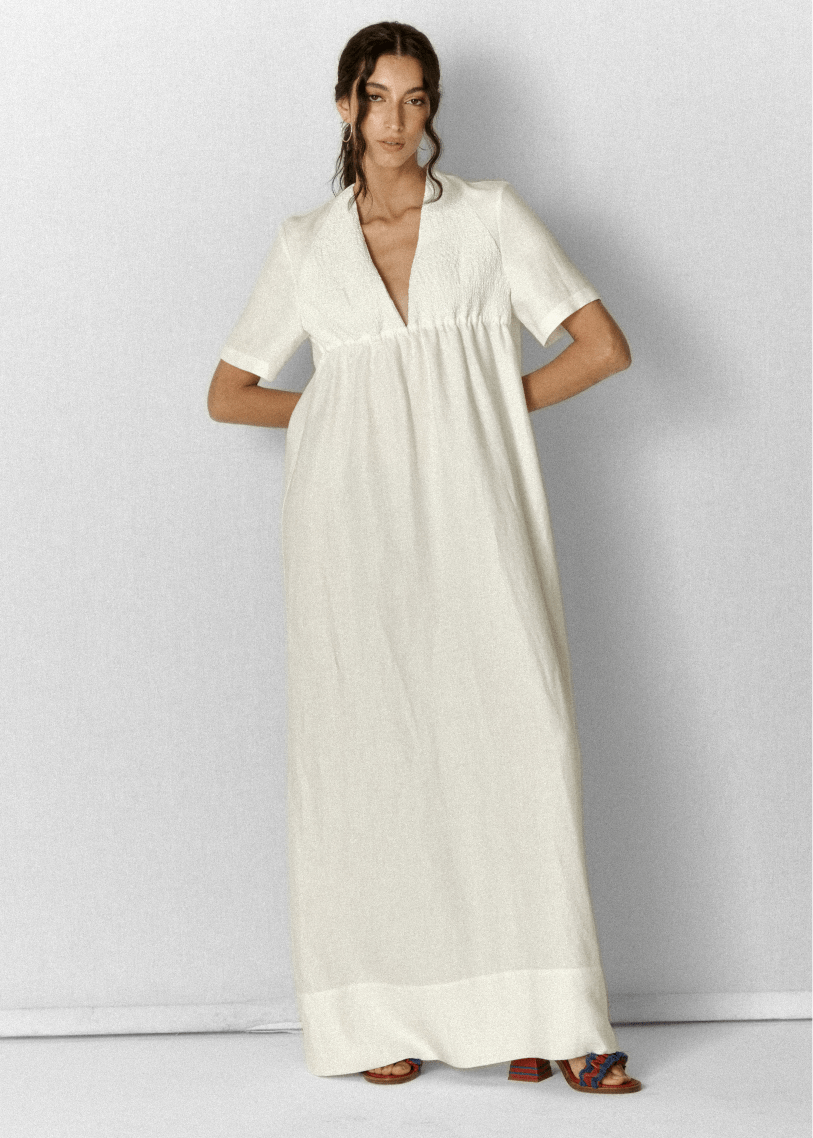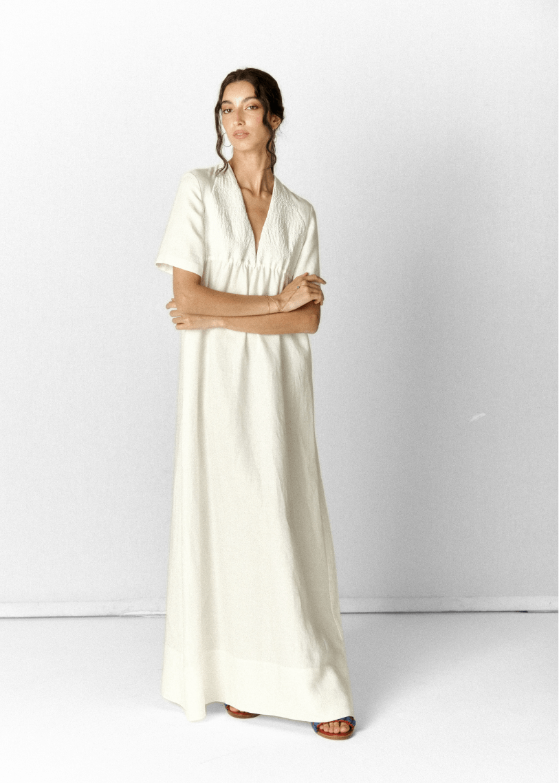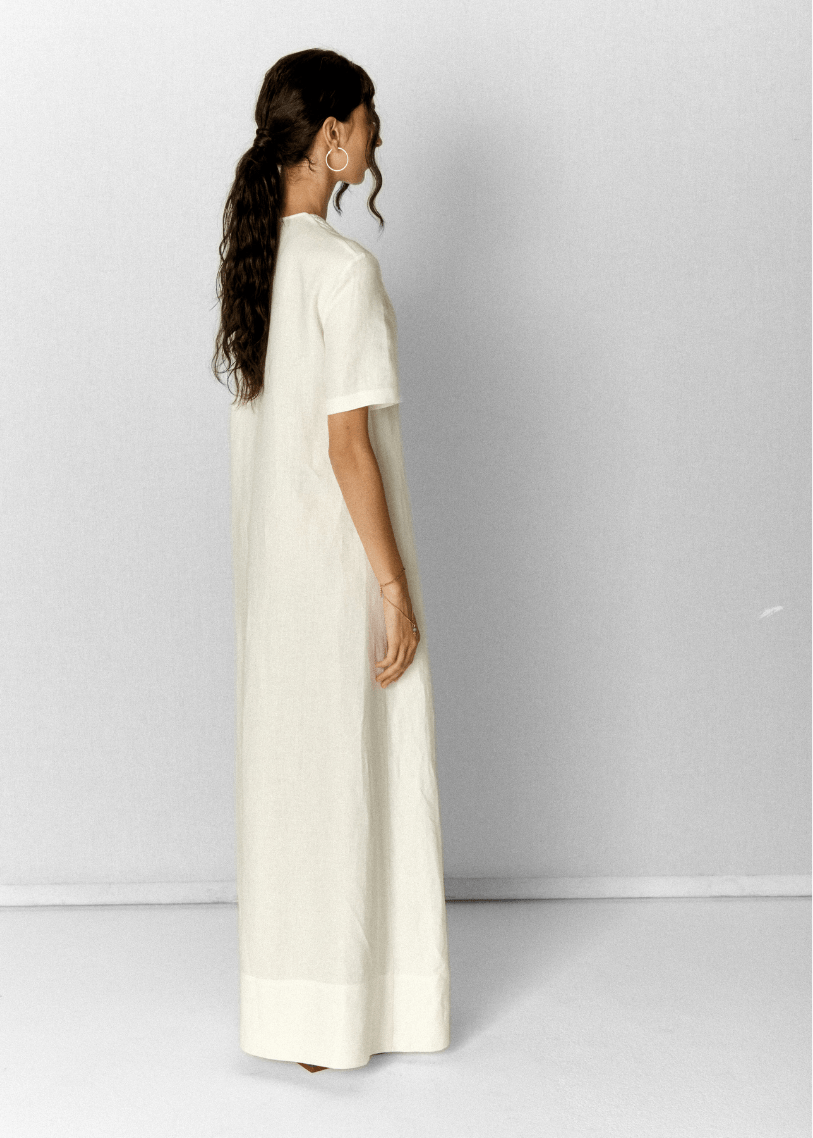 Abito lungo in lino fluido ricamamto dal taglio ampio, con linea morbida che scivola dritta fino ai piedi.