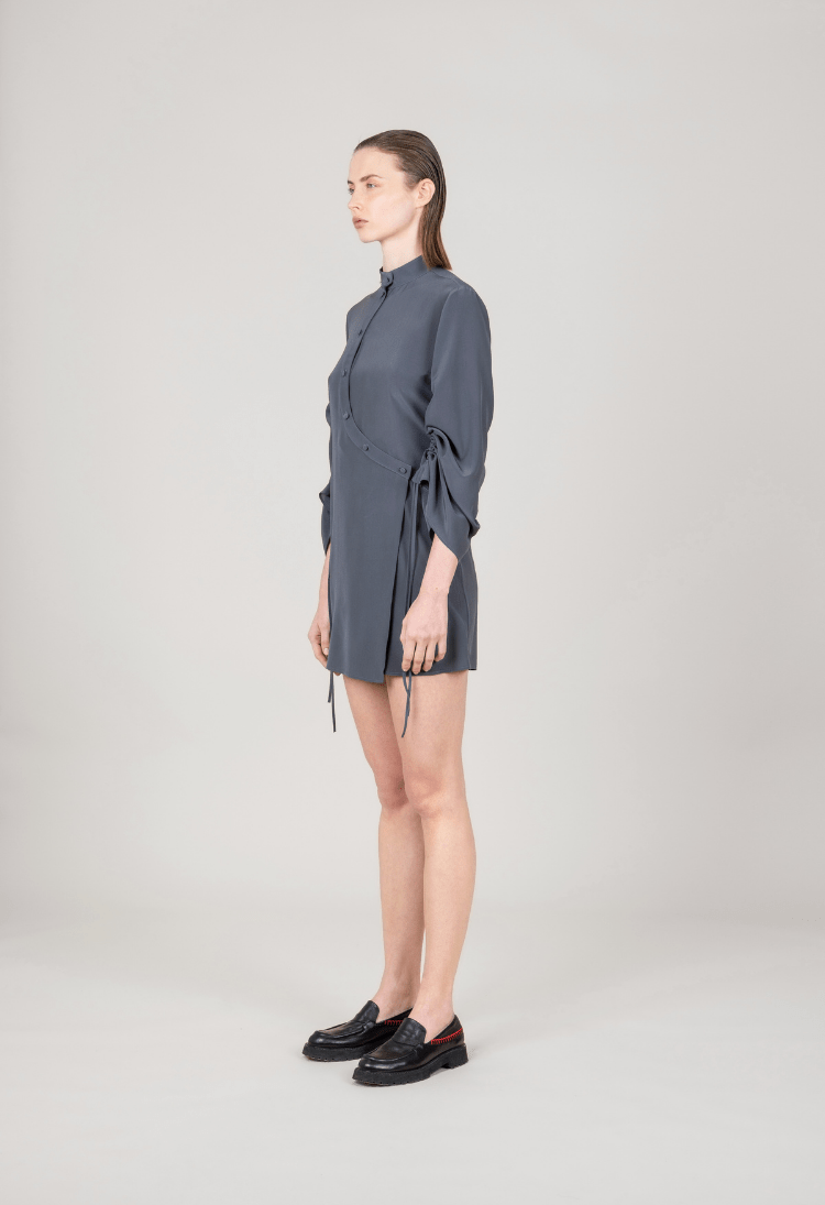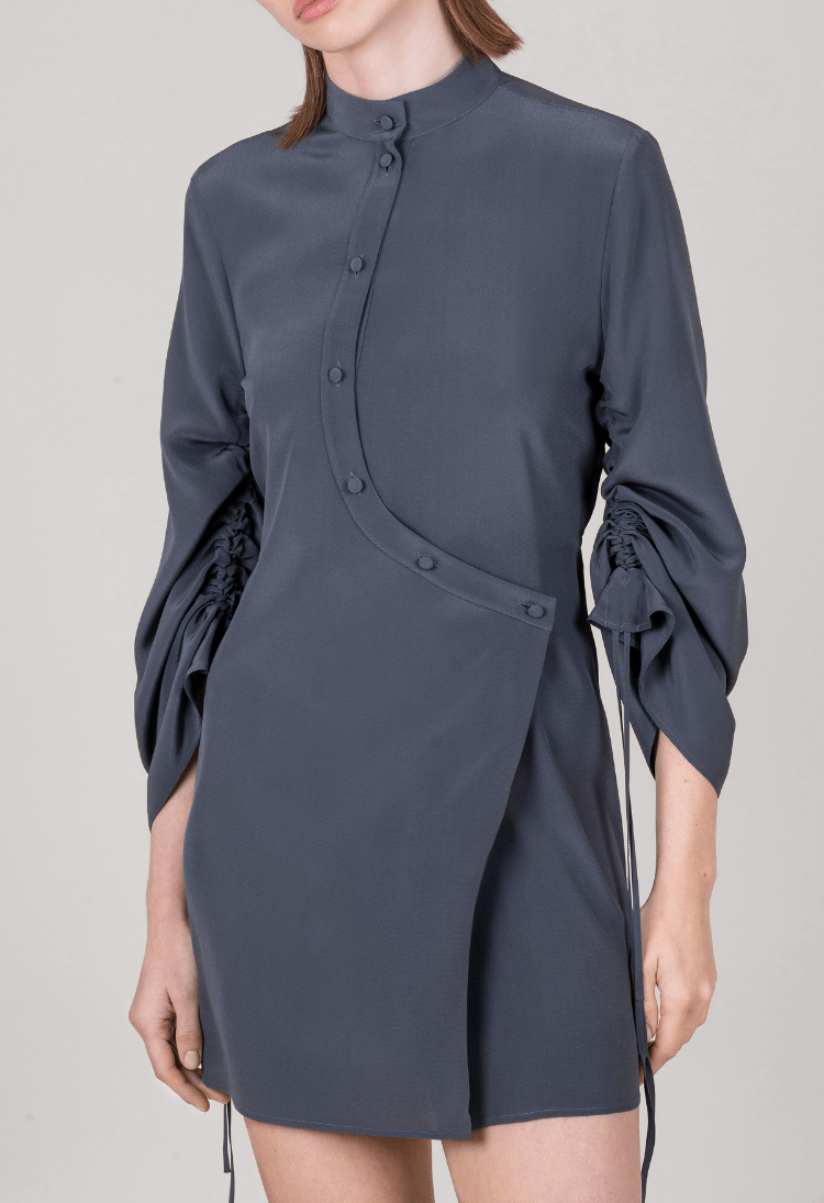 Abito mini in pura seta dalla linea aderente, con maniche a campana regolabili ed elastico regolabile solo su schiena.