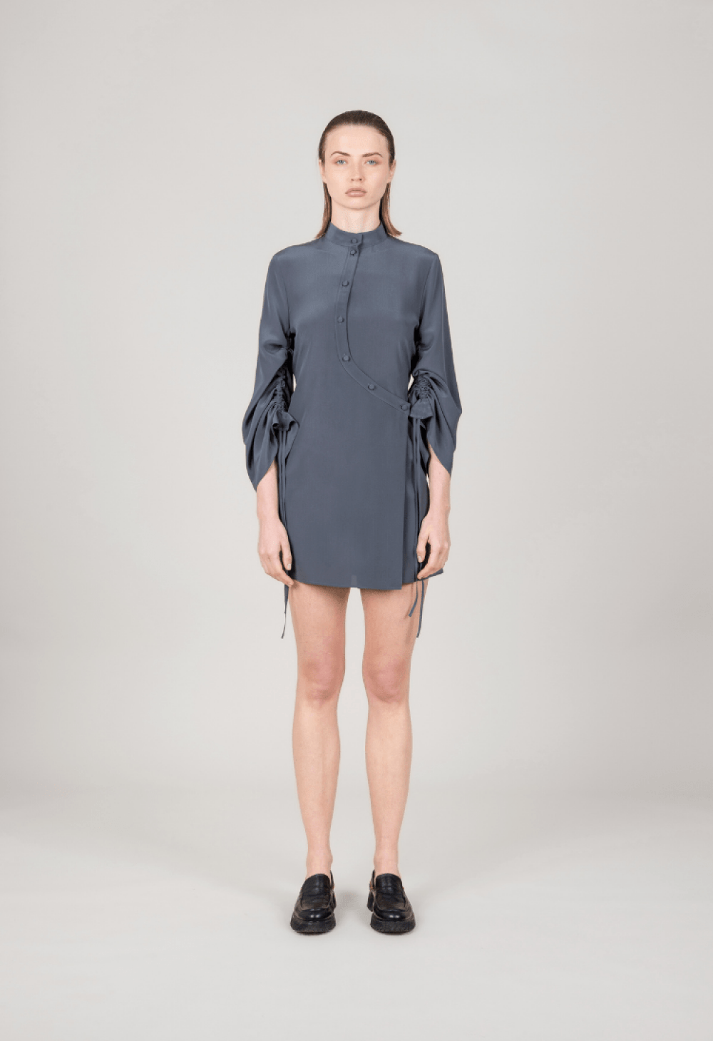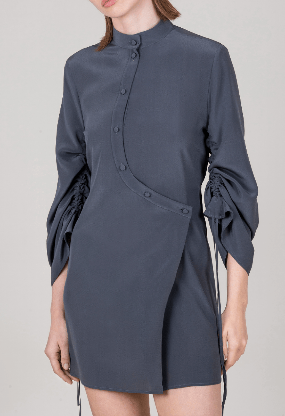 Apertura asimetrica con delicati bottoni bombè foderati