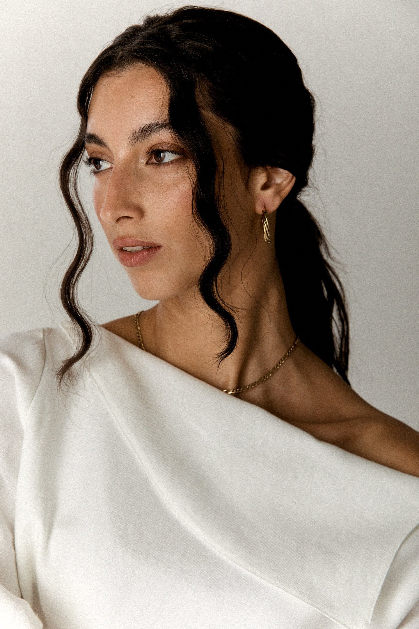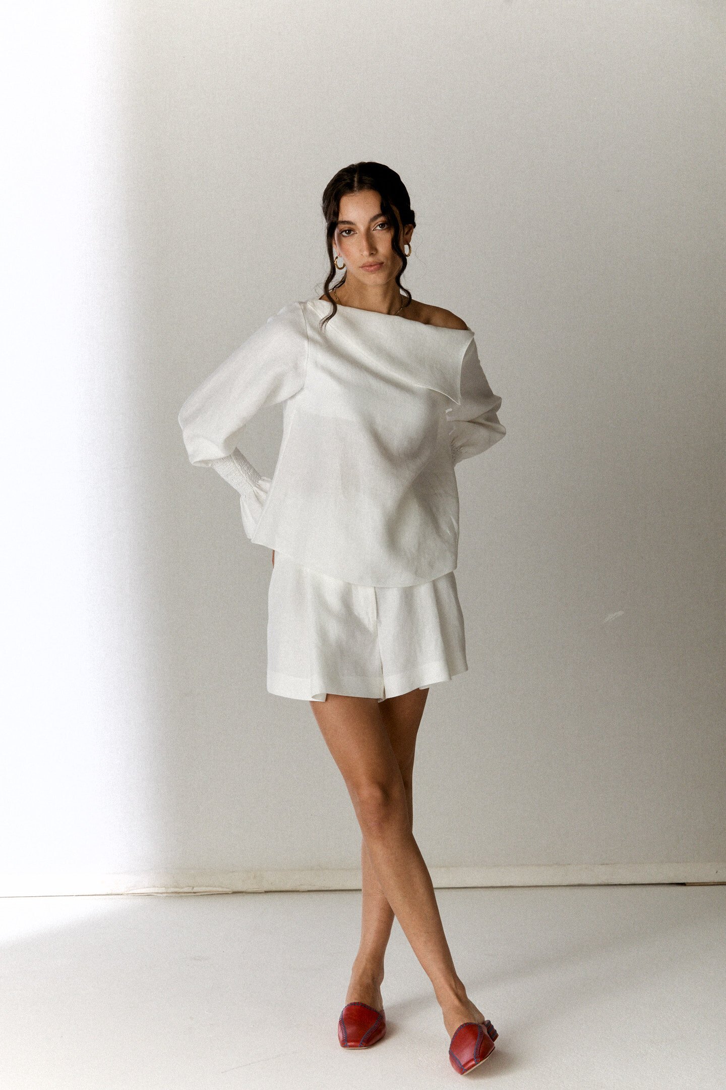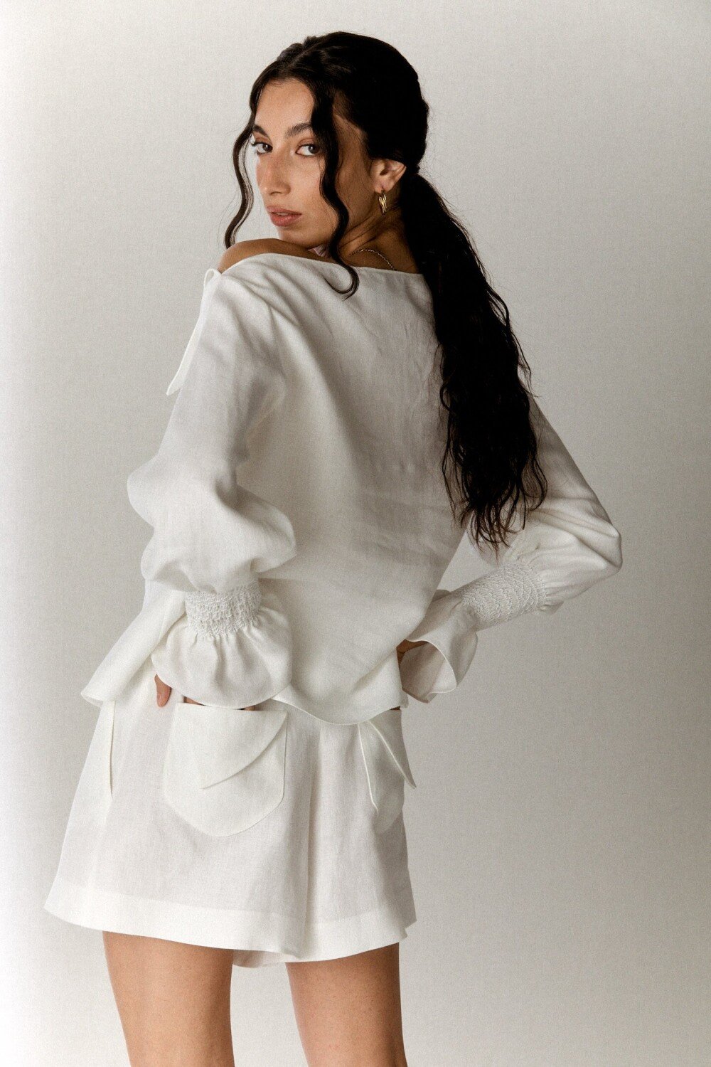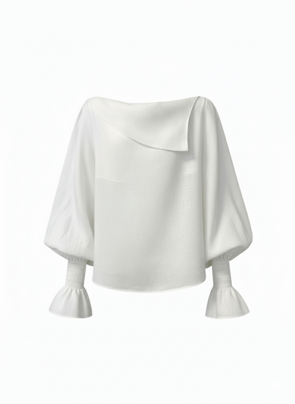 Blusa realizzata in tessuto leggero in morbido lino. Modello con scollatura asimmetrica a spalla scoperta. Vestibilità morbida, con maniche lunghe caratterizzate da polsini arricciati a punto smock, che creano volume al fondo manica.