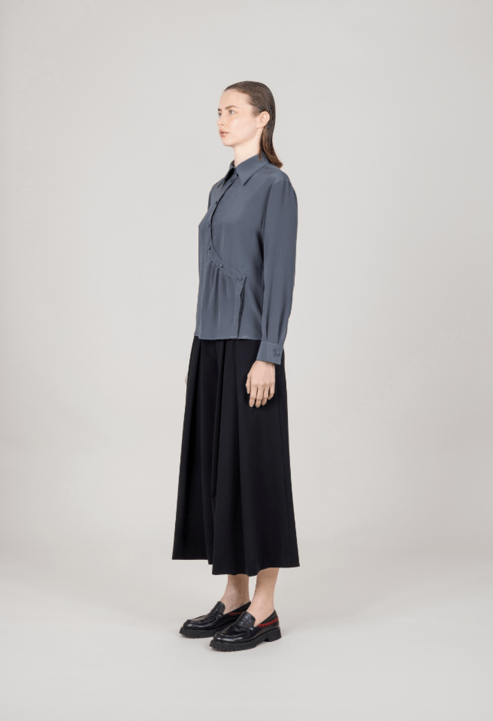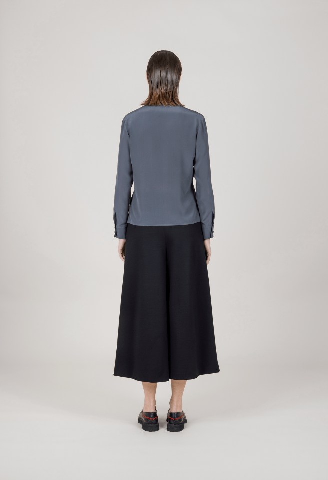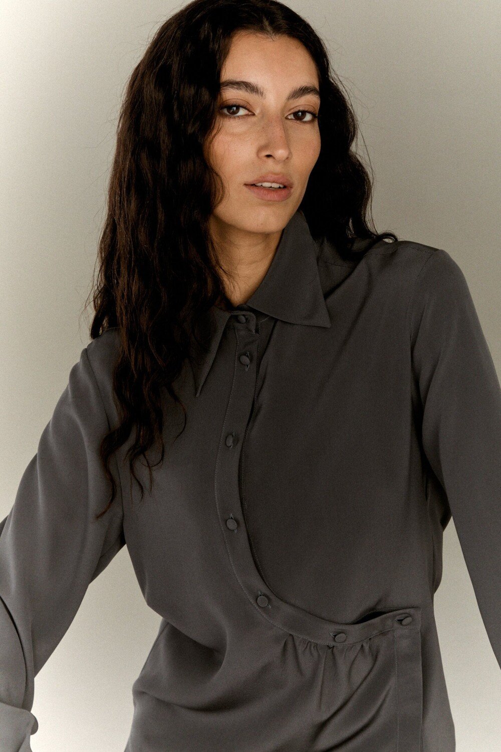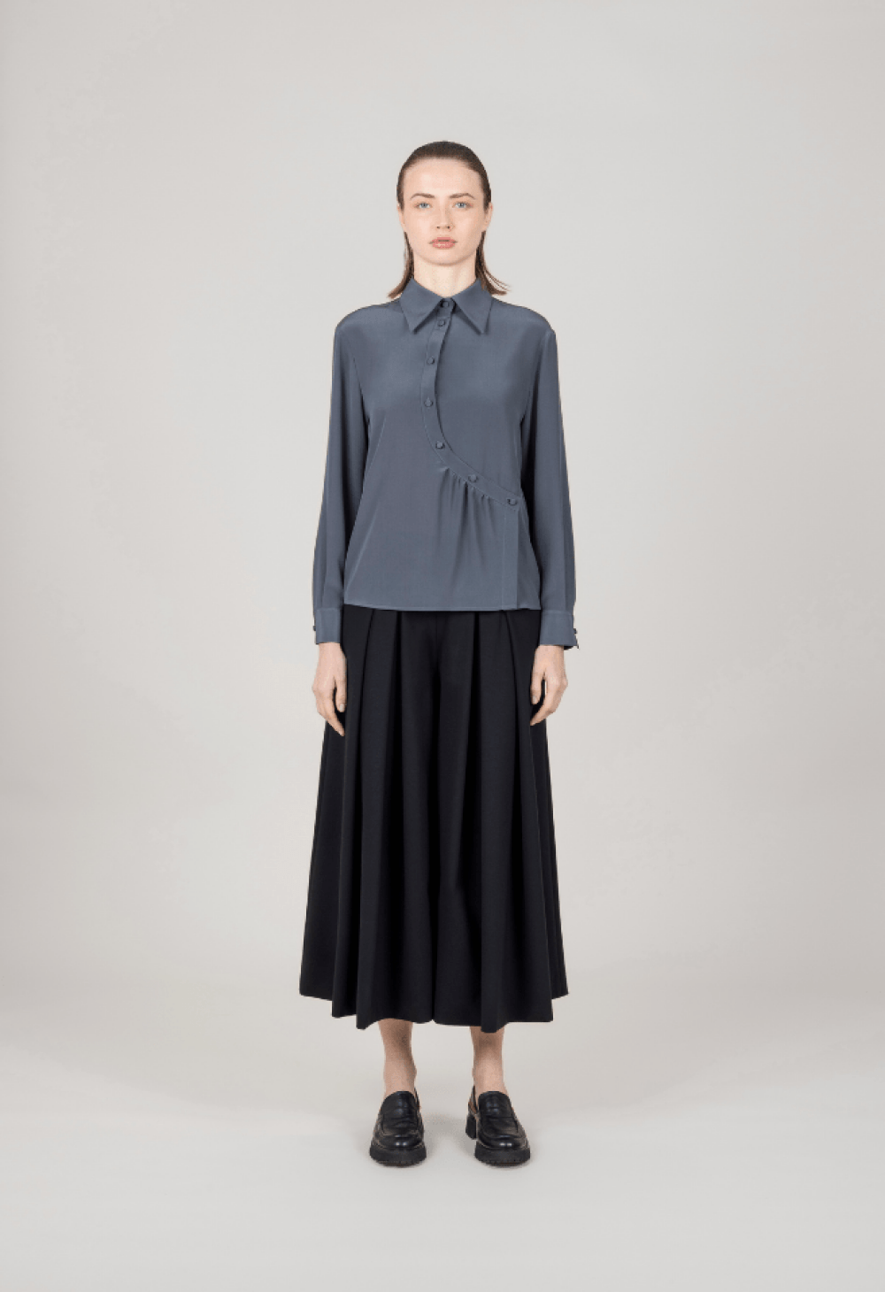 Camicia con coleltto e apertura asimmetrica data da bottoni foderati in pura seta. Maniche lunghe e vestibilità morbida per un’eleganza contemporanea e disinvolta.