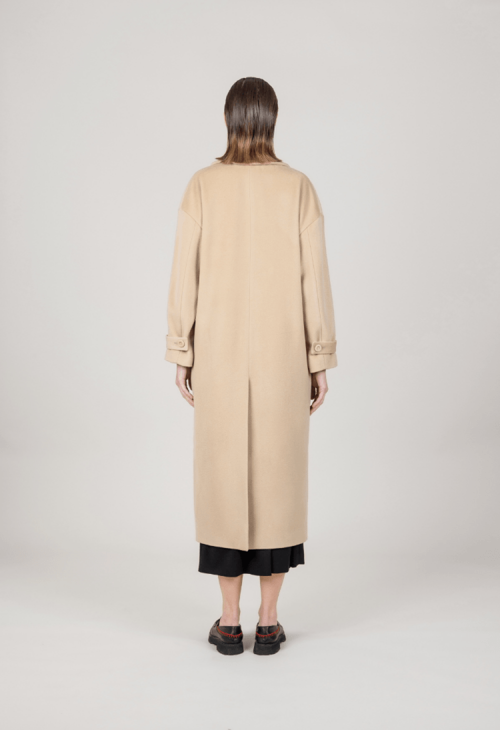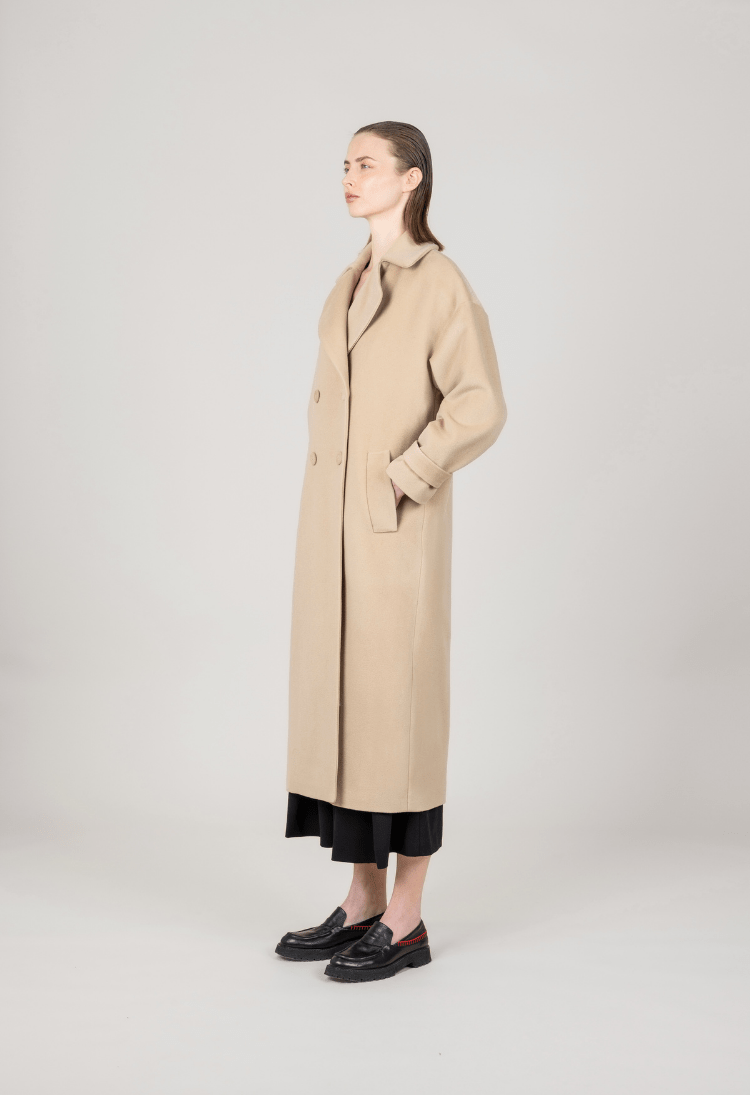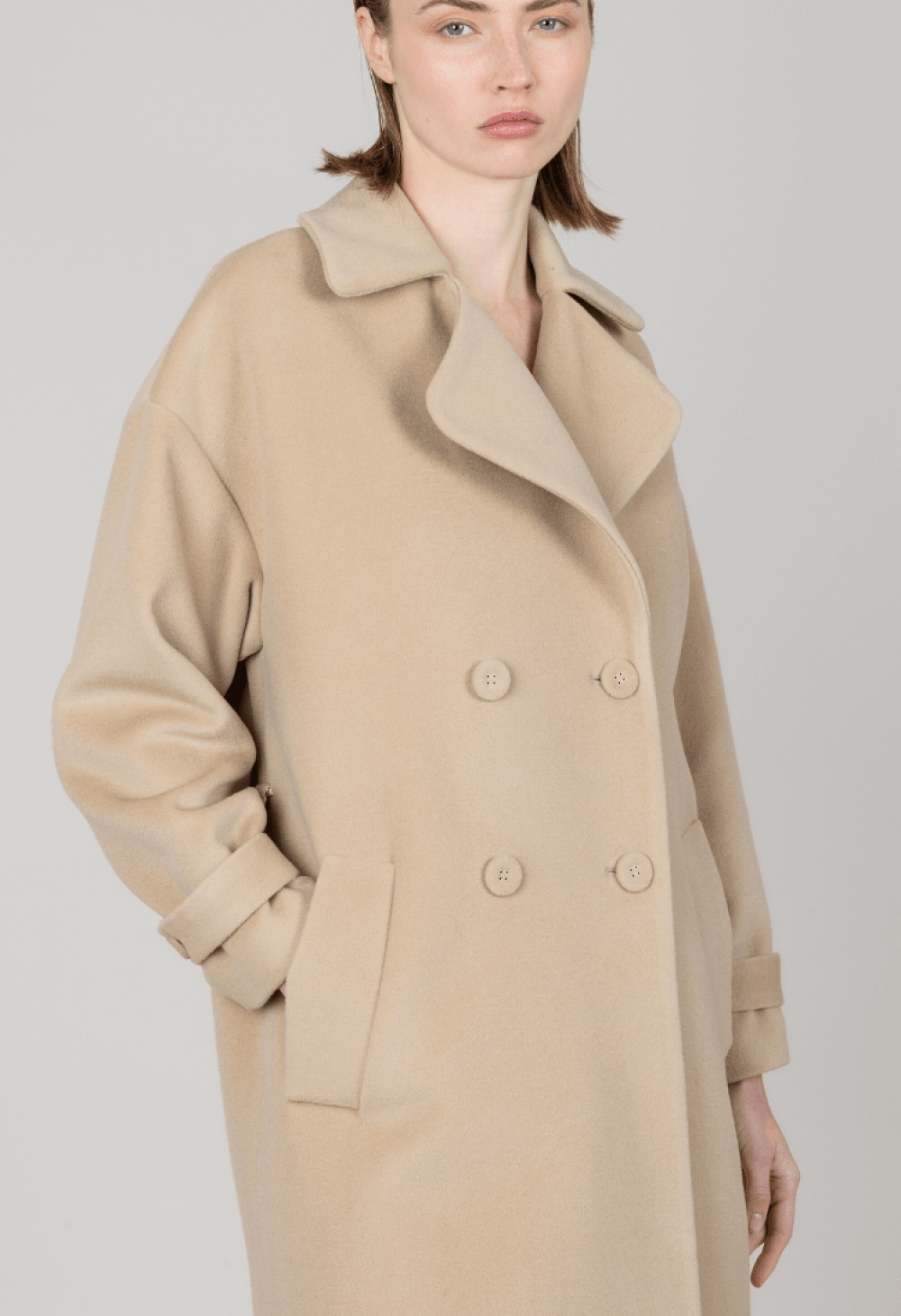 Cappotto lungo in pura lana dalla vestibilità oversize. Maniche ampie con alamari decorativi al polso. Chiusura doppiopetto con bottoni rivestiti tono su tono e lungo spacco su retro.