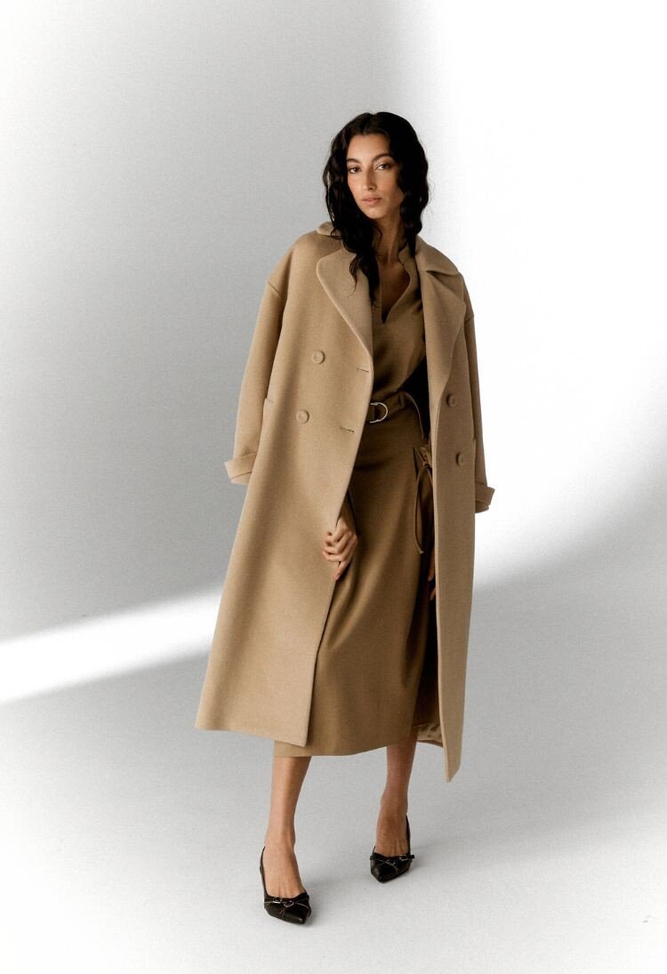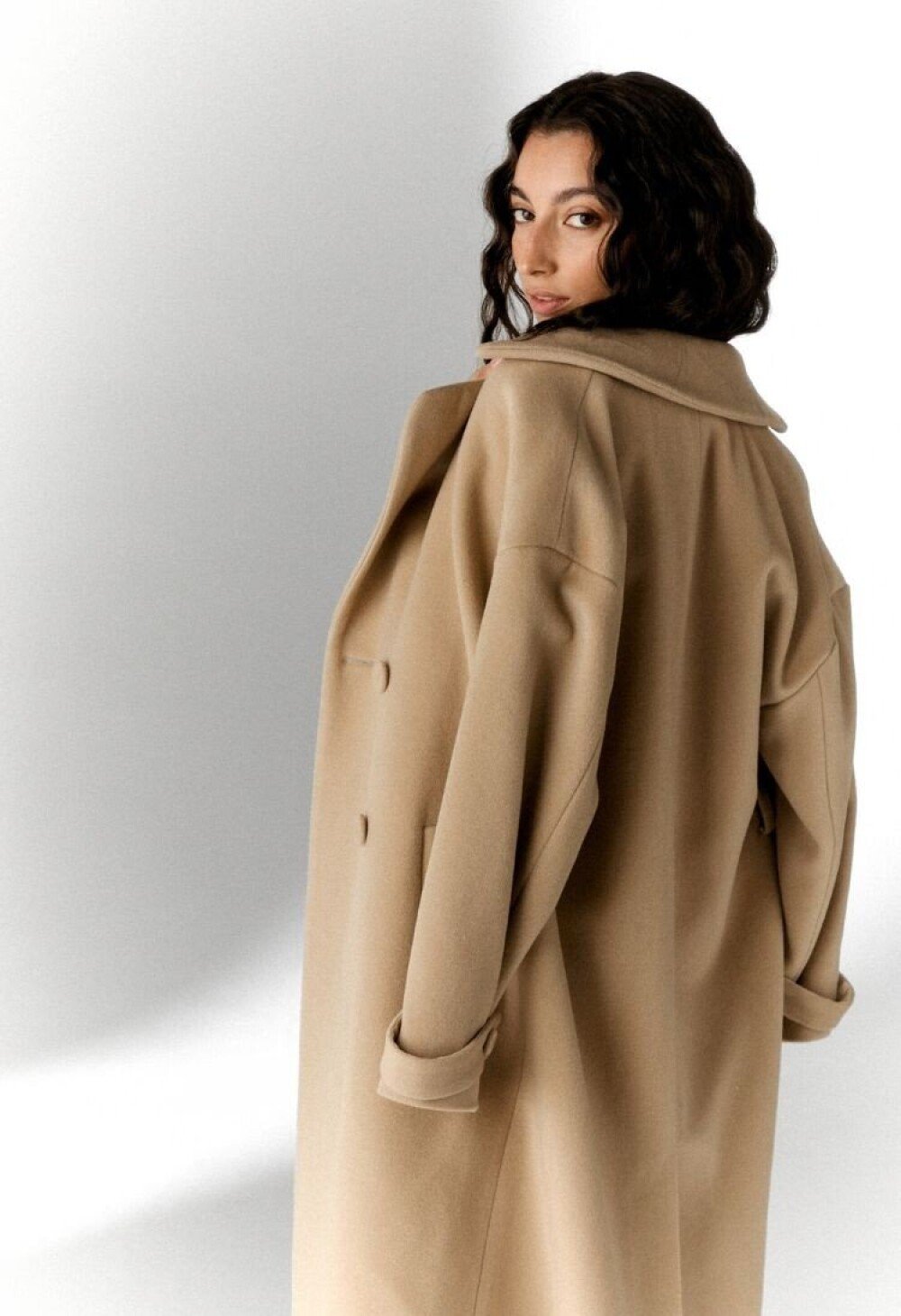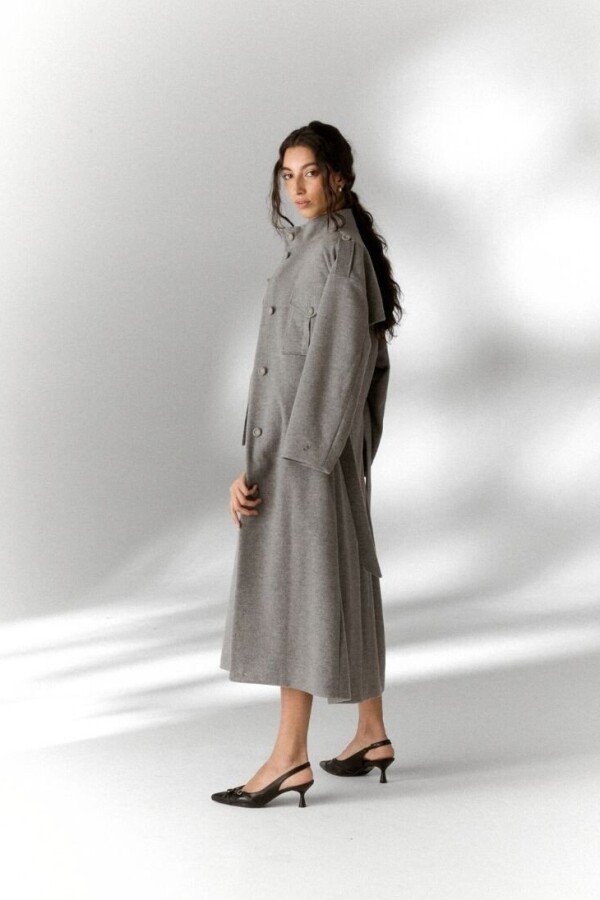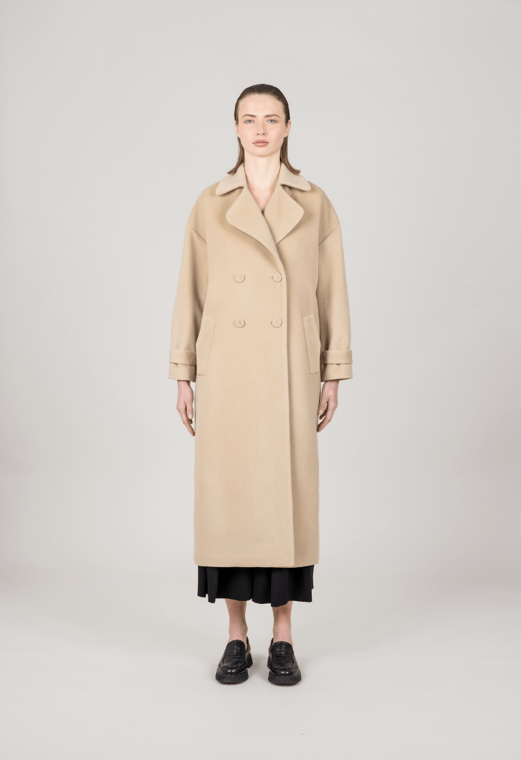 Cappotto lungo in pura lana dalla vestibilità oversize. Maniche ampie con alamari decorativi al polso. Chiusura doppiopetto con bottoni rivestiti tono su tono e lungo spacco su retro.