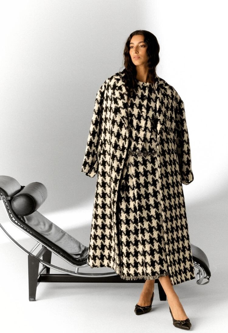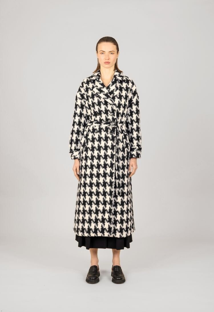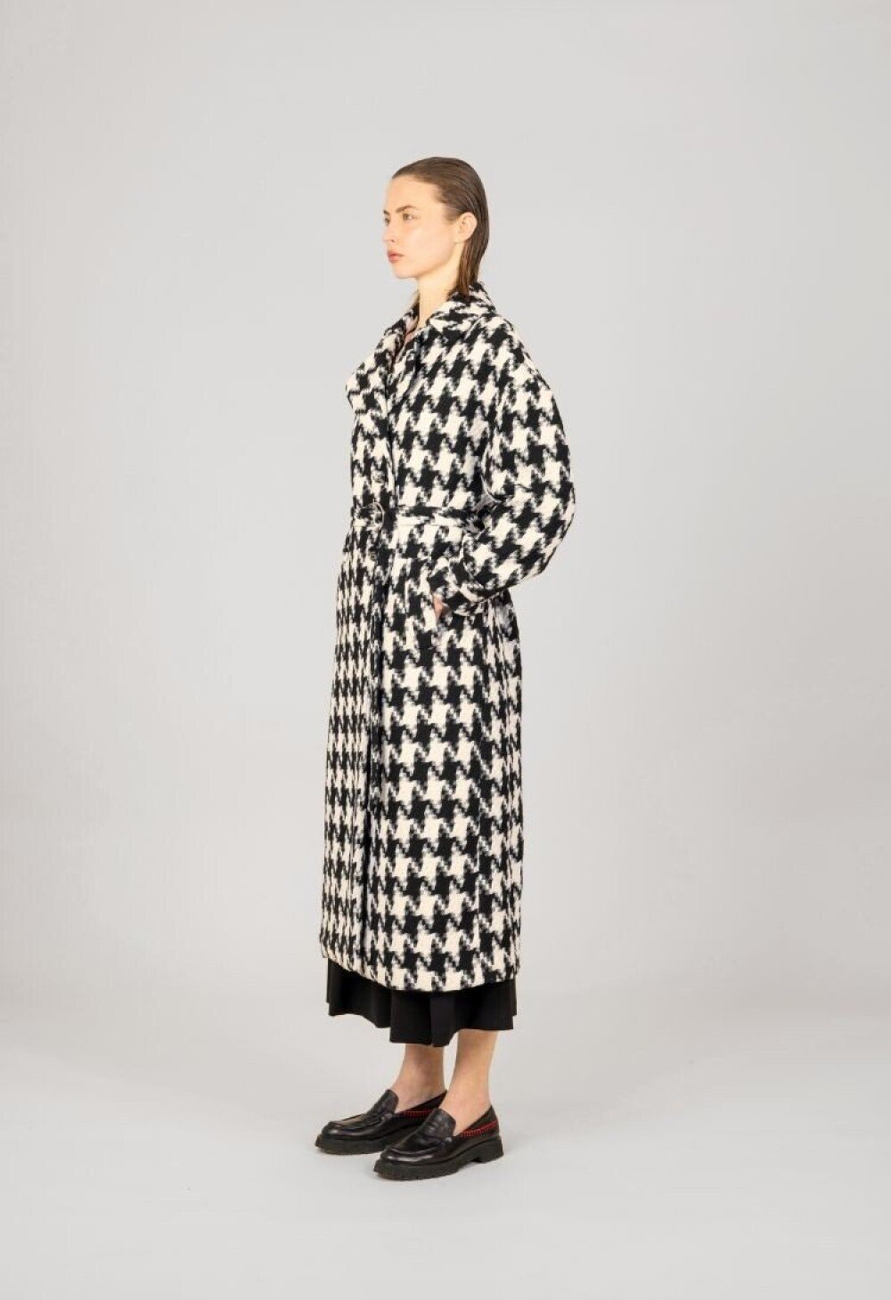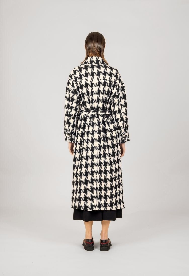 Cappotto foderato doppiopetto dalla vestibilità ampia. Maniche larghe e tasche laterali con pattina. Apertura frontale arricchita da grandi bottoni foderati.