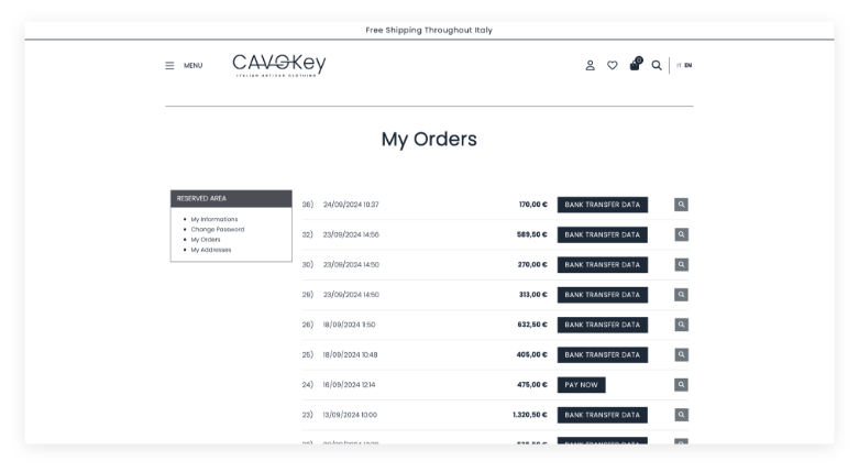 Go to the website cavokey.com and access the "My Orders" section (remember that to view the order list, you will need to log in using the email address used during your purchase).