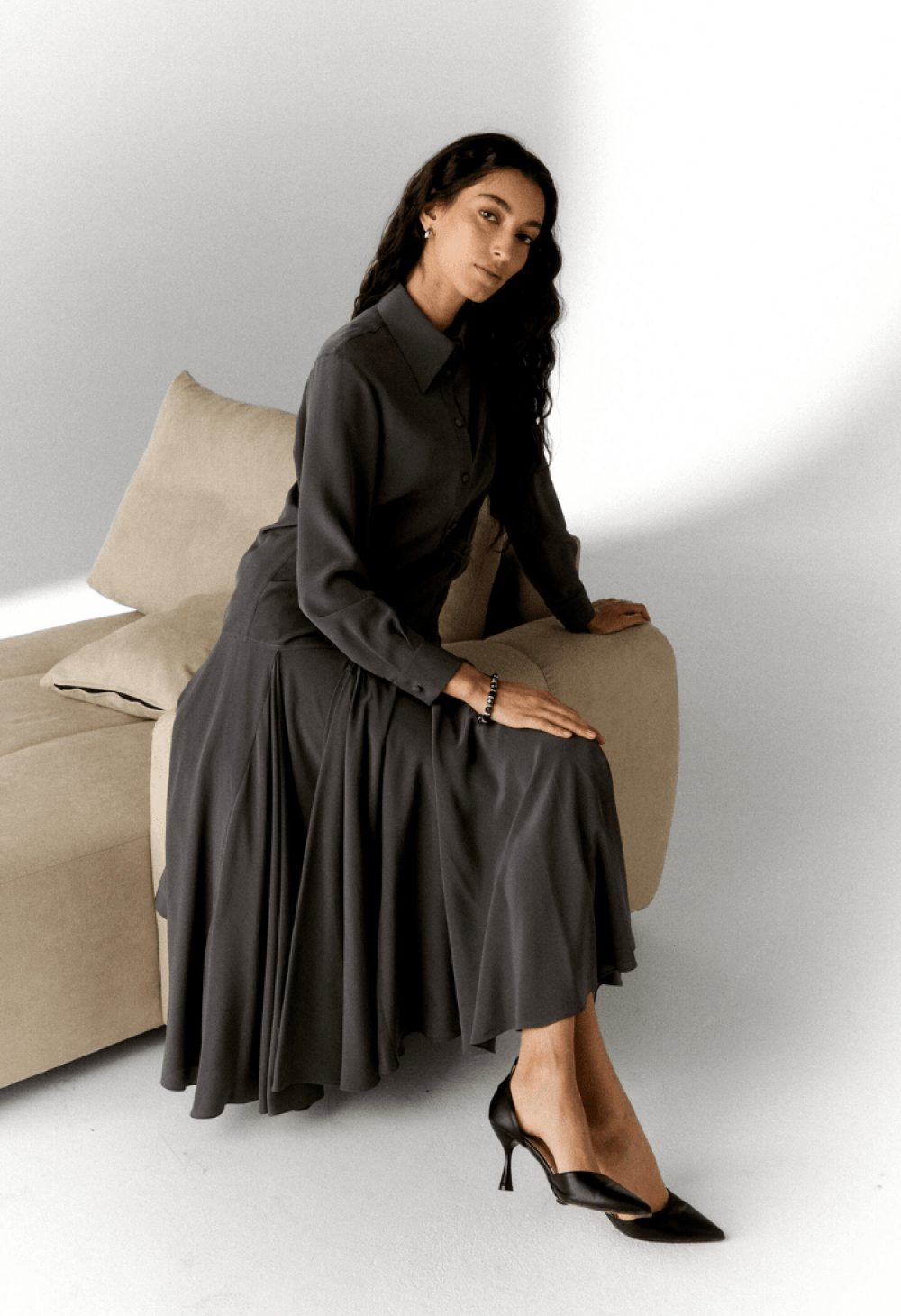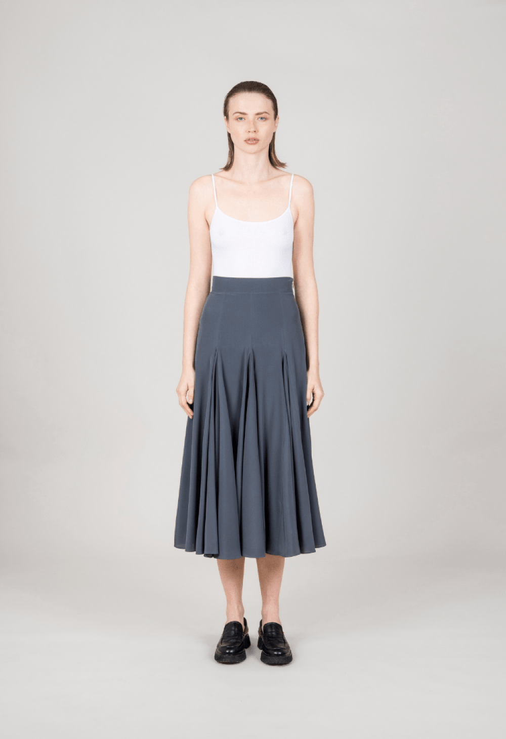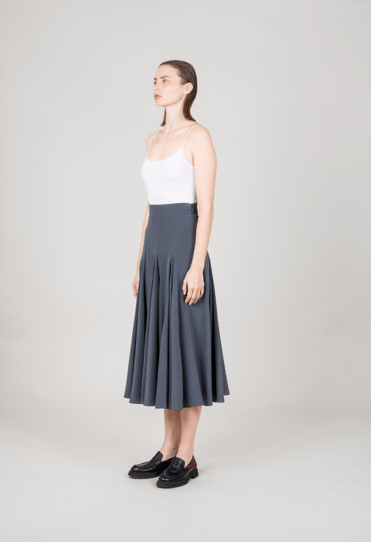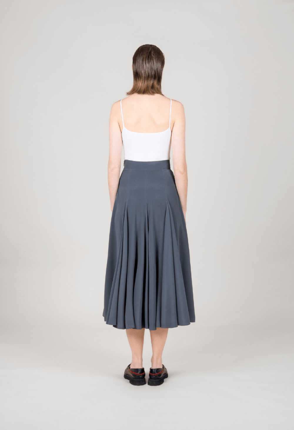 Gonna midi a ruota in pura seta cenere. La costuzione a spicchi dona un raffinato volume unito ad una ottima vestibilità.