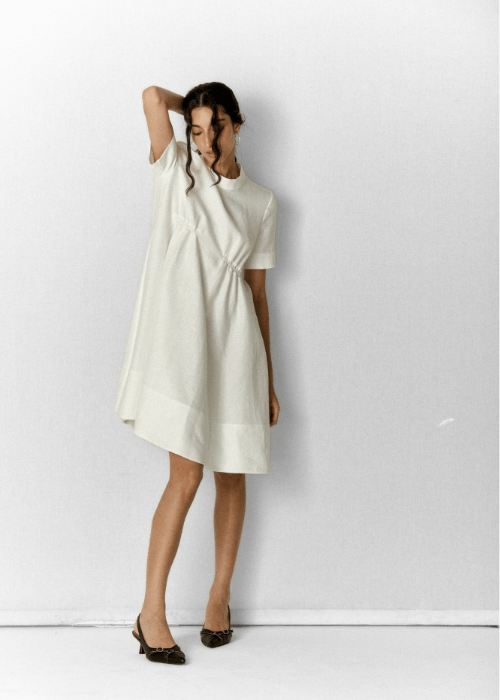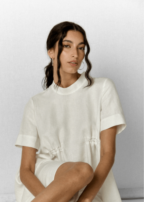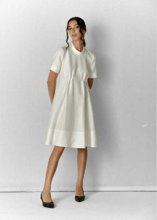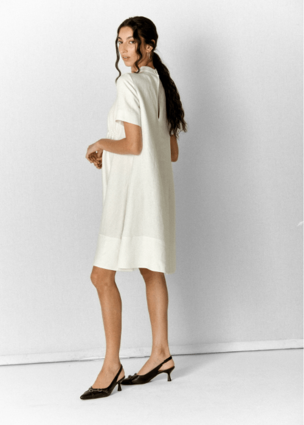 Abito midi in lino morbido dalla linea essenziale e femminile.